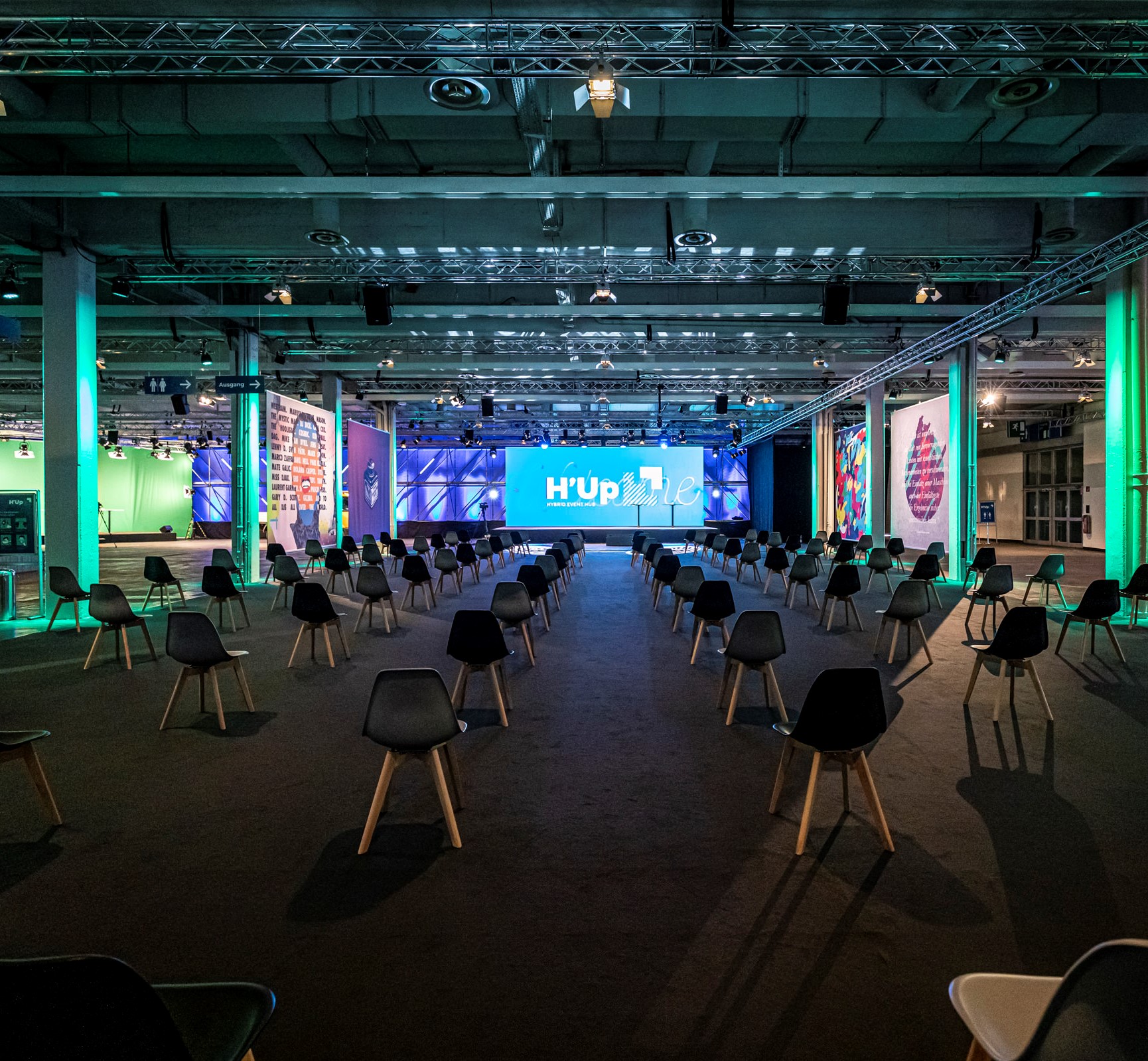 Get in. Perform & stream. H’Up is a multifunctional event venue with a built-in yet adaptable streaming studio. All set up and ready to go for ONLINE, HYBRID and LIVE events. The perfect setting for live digital and analogue communication.
